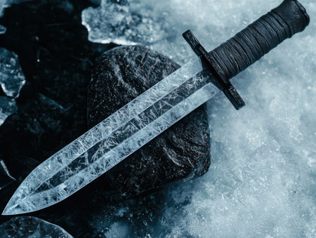 A clear, intricately designed sword lies partially buried in jagged ice, with droplets glistening around it, reflecting light in a magical, cold atmosphere.