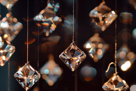 A dynamic abstract close up of faceted crystal elements showcasing sparkling light refractions and vibrant colorful bokeh, creating an elegant and luxurious visual effect.