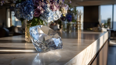 Large glass diamond sculpture is sitting on a marble countertop in a modern luxury apartment, illuminated by natural light, with a bouquet of flowers in the background