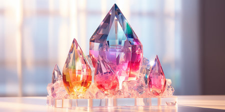 Iridescent crystals on illuminated podium, creating a mesmerizing display with vibrant reflections