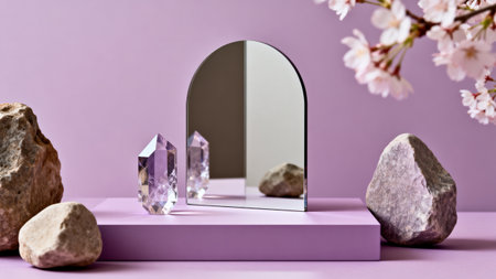Purple crystal and mirror on pedestal