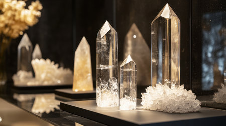 Elegant crystal display stands with minimalistic decor.