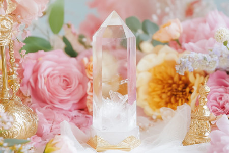 This stunning quartz crystal shines amidst colorful blooms, embodying elegance and tranquility in harmony.