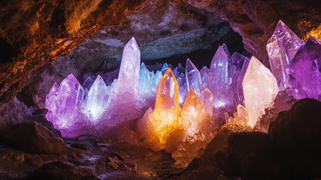 Colorful crystals emerge from rocky surfaces in a cave, radiating natural light that highlights their unique shapes. The serene setting showcases natures beauty and artistry.