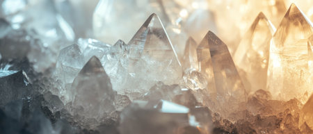 Clear quartz crystals with transparent surfaces showcasing multifaceted textures and clarity