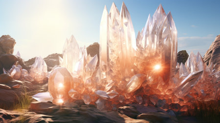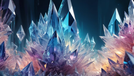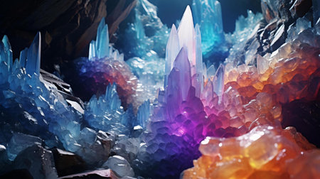 Colorful crystal formations shining under a radiant glow with vibrant hues