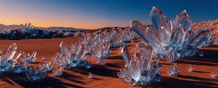 An alien planet's towering crystalline formations cast long shadows under a dual-sun sunset, showcasing vibrant, swirling nebulae in the sky --chaos 30 --ar 16:9 --v 6.1 Job ID: 117774b2-9b47-4cb3-8756-d35730c78988