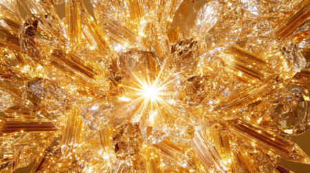 This captivating abstract image features a stunning explosion of golden crystals, creating a radiant and luxurious atmosphere perfect for design projects.
