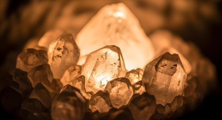 A cluster of quartz crystals glowing with a warm, amber internal light against a dark background. The macro shot emphasizes the geometric facets and the magical, spiritual energy of the minerals.