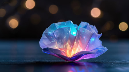 A captivating close-up of a colorful flower made from plastic, glowing with bright lights. The blurred bokeh background enhances its artistic appeal.