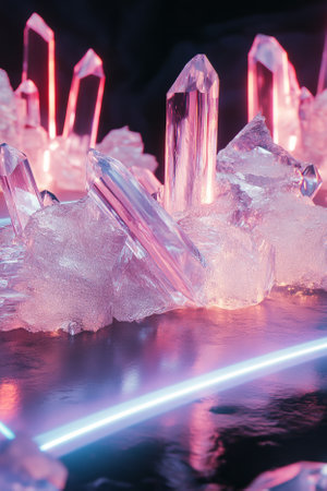 Iridescent crystals on illuminated podium, creating a mesmerizing display with vibrant reflections