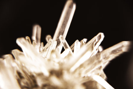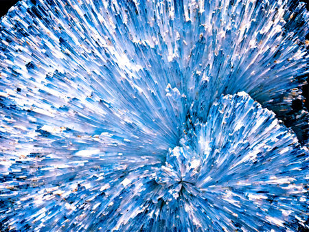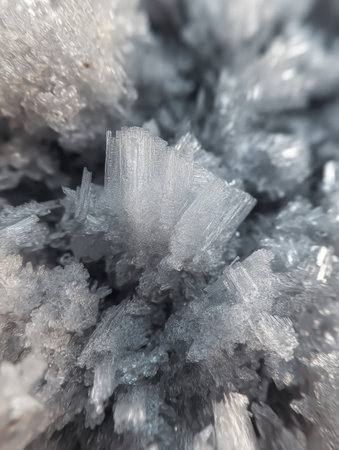 Abstract macro view of hoarfrost forming star-like ice structures on surfaces