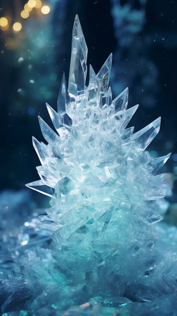 The striking geometric icy crystals emit an ethereal glow, reflecting abstract patterns against a rich blue background.