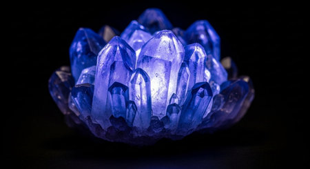 Blue crystals on dark, glowing intensely, detailed and vibrant crystalline formations