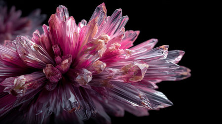 Captivating close-up of exquisite pink crystal formations, presenting a mix of sharp facets and ethereal colors that reflect natural elegance on a dark backdrop.