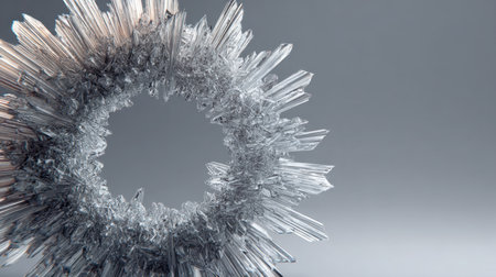 An abstract crystal formation displays sharp edges and radiant shine, creating a striking circular pattern against a minimalist gray background.