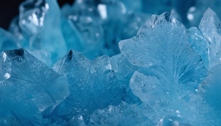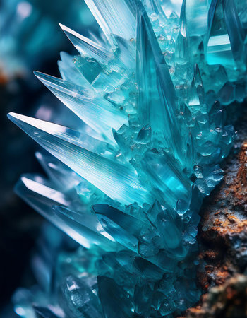 Captivating close-up of glimmering blue crystals, highlighting their sharp edges and intricate formations. A serene representation of nature's beauty.