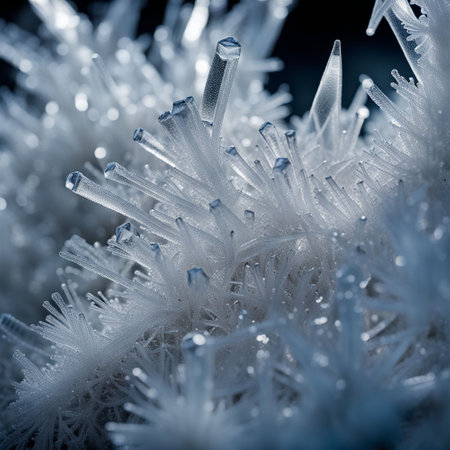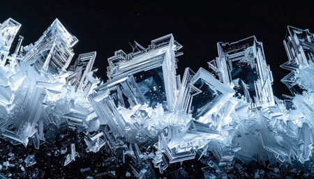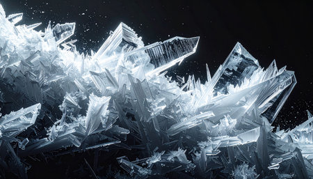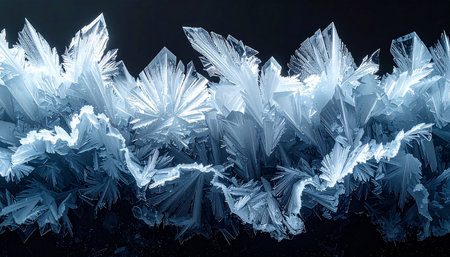Macro view of sharp ice crystals and frost formations creating a detailed, textured pattern against darkness.