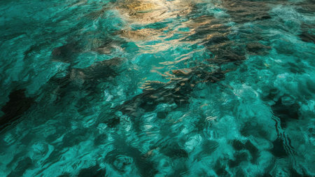 A serene view of crystal clear turquoise water, featuring the playful reflections of sunlight creating stunning patterns and shimmering highlights across the surface.