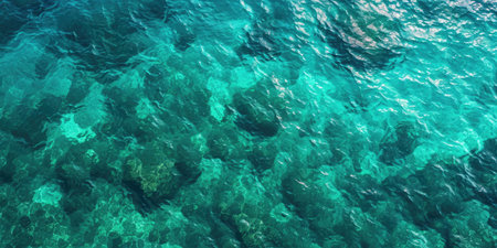 Aerial view of clear turquoise ocean water with coral reefs, nature background. Underwater marine life concept