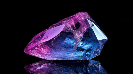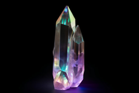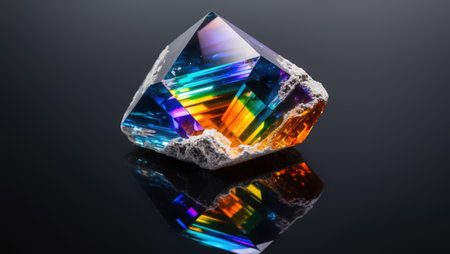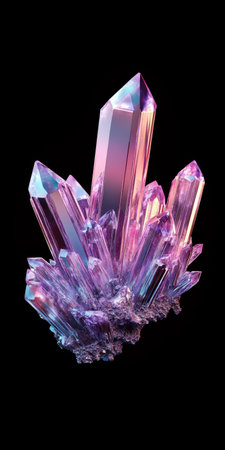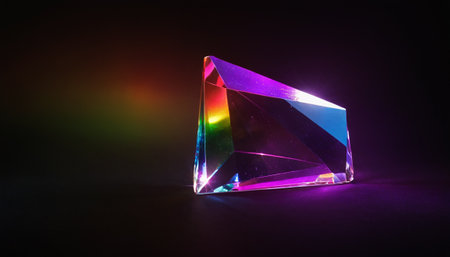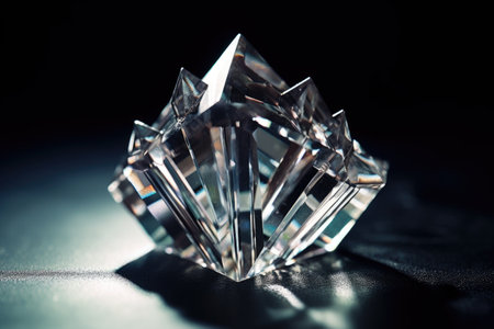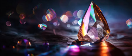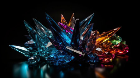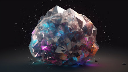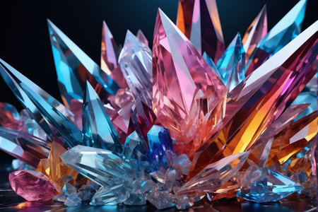 An image showcases a close-up of a crystal formation. The composition features sharp, geometric shapes and facets, with a play of light creating vibrant colors. The textures appear smooth with highlights and shadows, hinting at an environment with focused lighting. This image could be used for various design projects and visual media.