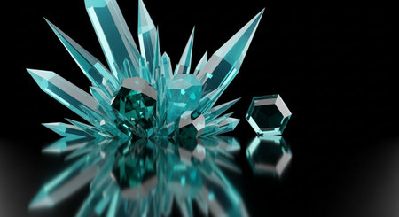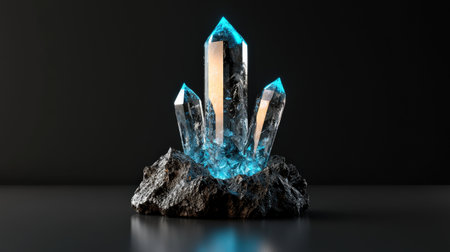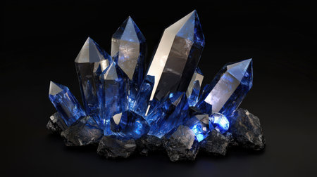 Sharp blue crystals illuminated against black, glowing in radiant light, captivating design