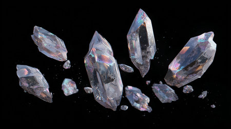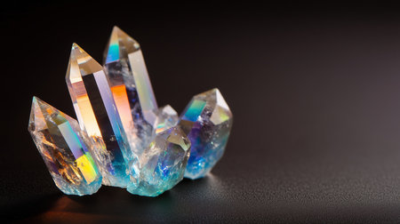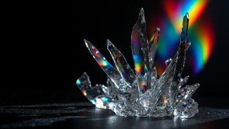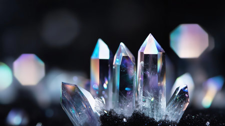 Stunning arrangement of clear quartz crystals reflecting light on a dark, textured surface