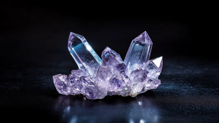 Beautiful cluster of purple quartz crystals shining against a dark background with natural reflections