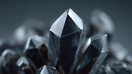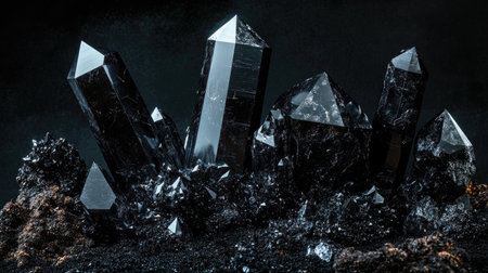 Mesmerizing close-up of black crystal points showcases sharp edges and shine against a dark background, highlighting the intricate beauty of nature's formations.