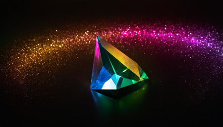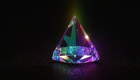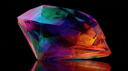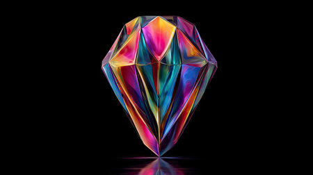 A vibrant illustration presents a multi-colored diamond shape against a stark black backdrop. The artwork showcases a range of bright hues, reflecting light in a faceted manner. This digital creation evokes a sense of preciousness and could serve various commercial or design purposes, offering visual appeal.