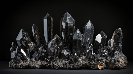 A captivating arrangement of black crystals featuring sharp points and glossy surfaces, showcasing nature's artistry against a sleek dark background.