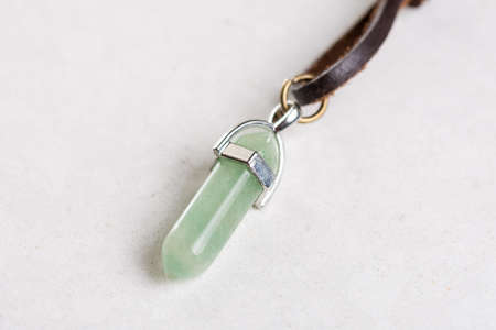 Lucky green aventurine semiprecious stones necklace isolated above white marble stone.