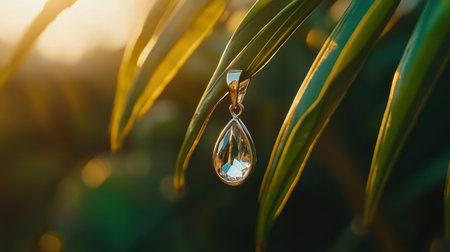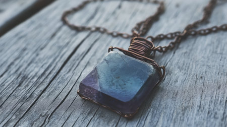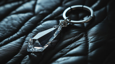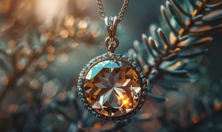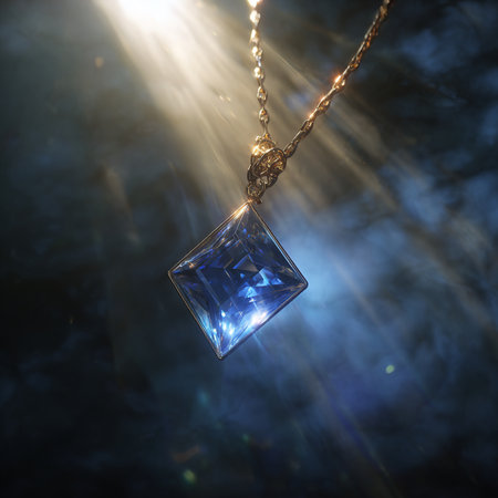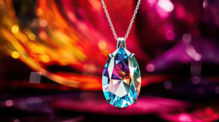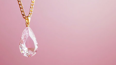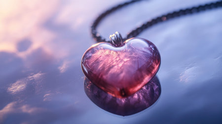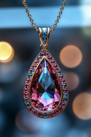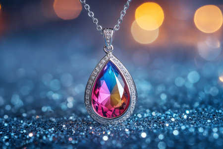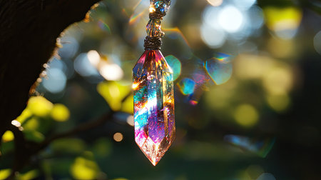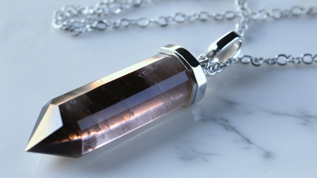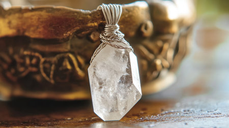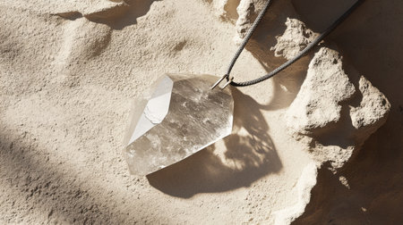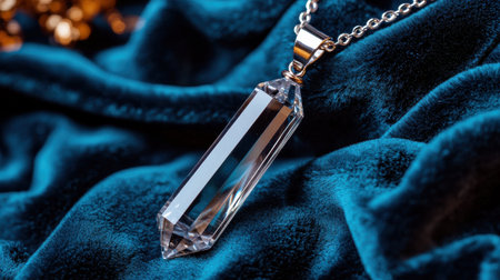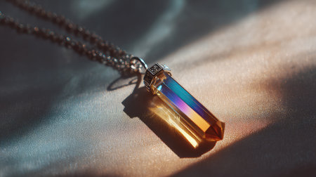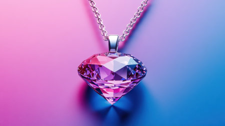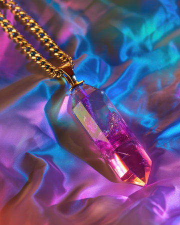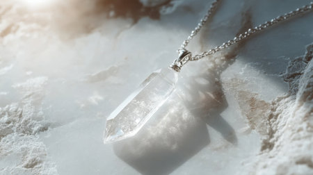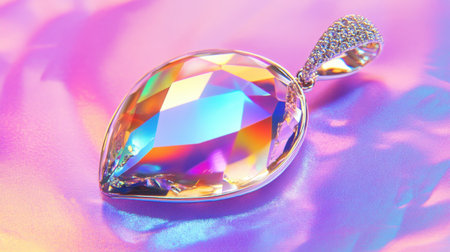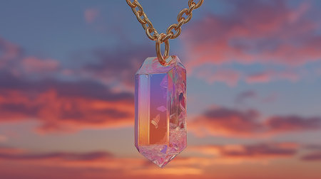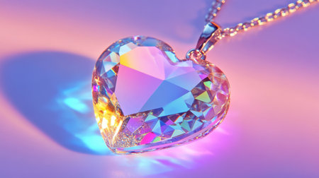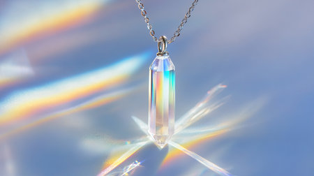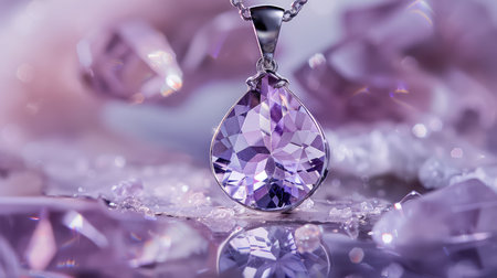 Shimmering clear crystal pendant. Iridescent facets reflecting light. Gemstone jewelry on a soft lavender background. Surrounded by scattered smaller amethyst shards. Healing crystal imagery. Elegant spiritual accessory. Magical sparkle. Unique design element. Meditation tool. Feminine aesthetic. Precious stones display.