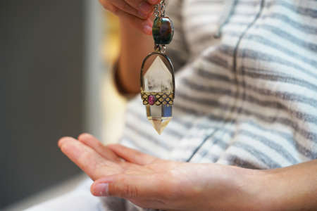 holding and using quartz crystal pendulum and using it In asking questions. Quartz Crystal Pendulum Hanging over a Hand