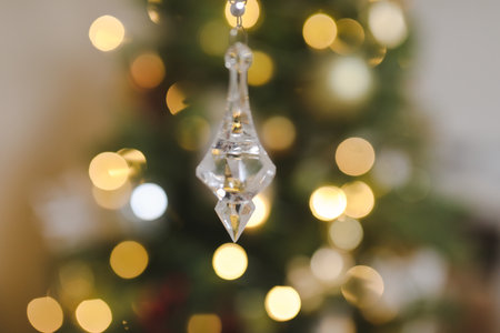 Christmas and New years eve Background. Close up of balls on christmas tree. Bokeh garlands in the background. New Year concept. Decorated Christmas tree on blurred, sparkling and fairy background