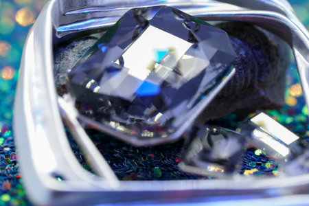 Macro mineral stone rhinestone, rock crystal on a black background close up, Transparent quartz.