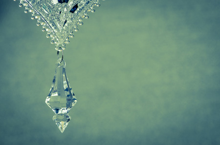 Crystal ornaments on antique chandelier. Cold white color balance. Vertical photo.