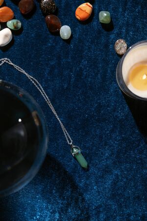 Top view of crystal ball, candle and fortune telling stones on dark blue velour cloth