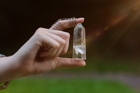 Woman meditating with crystal to heal or restore her aura outdoors, closeup