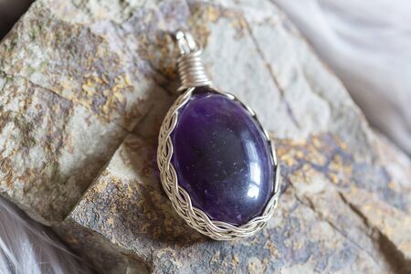 Crystal on linen fabric surface, mock-up for postcard or background for website and mobile devices. Gem colored in royal purple