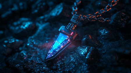 Futuristic crystal gemstone with blue neon light. 3D rendering