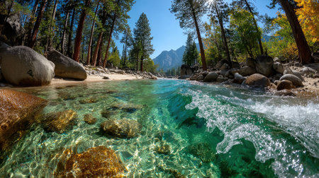 Photograph of an underwater view capturing the crystal-clear water and pebbles on both sides, with trees in the background. The wave is captured mid-break, a powerful display of nature's power. Captured with a Nikon D850, wide-angle lens, f/4 aperture, and low ISO setting for clear details. Bright sunlight highlights the natural beauty of the river stones and forest backdrop. This scene symbolizes tranquility amidst motion. --chaos 20 --ar 16:9 --stylize 750 --v 7 Job ID: 973cecc6-504f-4dd1-83f6-f6b640e1392a