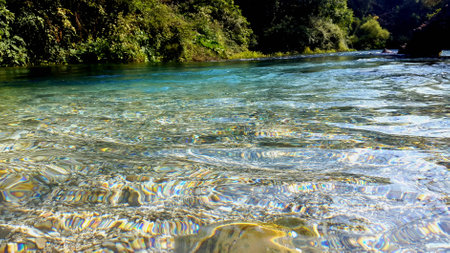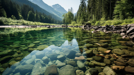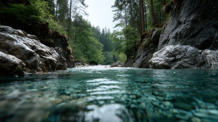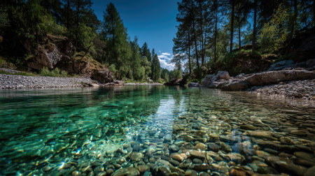 A tranquil river scene showcases crystal-clear water flowing over a bed of stones. Tall trees line the banks, creating a natural frame. The composition features a low-angle perspective, emphasizing the texture of the stones. The image suggests environmental themes suitable for various commercial and illustrative purposes.