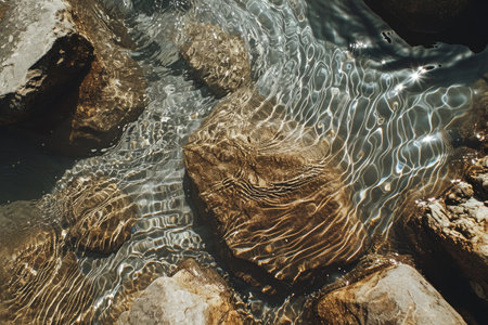A detailed view of rocks and rushing water in a stream, Bird's eye view of sunlight glittering on ripples around rock clusters, AI Generated