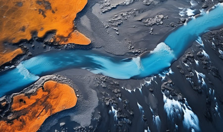 Aerial view of a winding river flowing through the rugged landscape adorned with patches of colorful moss and rocks