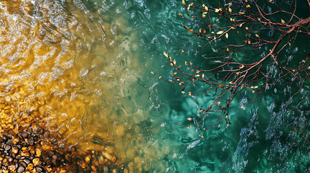 Overhead shot showing the confluence of rippling water currents flowing over submerged rocks in the river, and autumn tree branches with golden leaves reaching over the water.