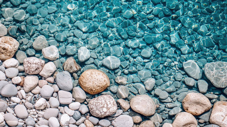 Natural riverbed stones in various colors create a striking pattern under gently ripping water. Sunlight reflects off the surface enhancing the beauty of the scene.