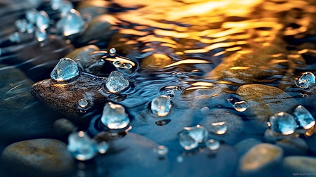 Close-up of clear water flowing gently over smooth stones in a serene stream, with sunlight glistening on the surface