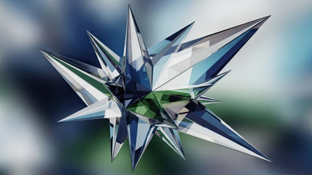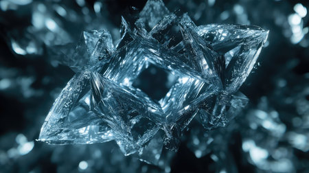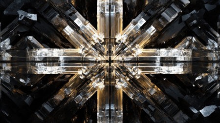 Geometric abstract pattern with intersecting crystal-like reflective beams, creating a symmetrical design. The image features a mix of dark and light tones with a metallic appearance
