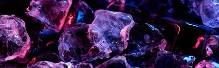 panoramic shot of clear ice cubes with purple colorful lighting isolated on black